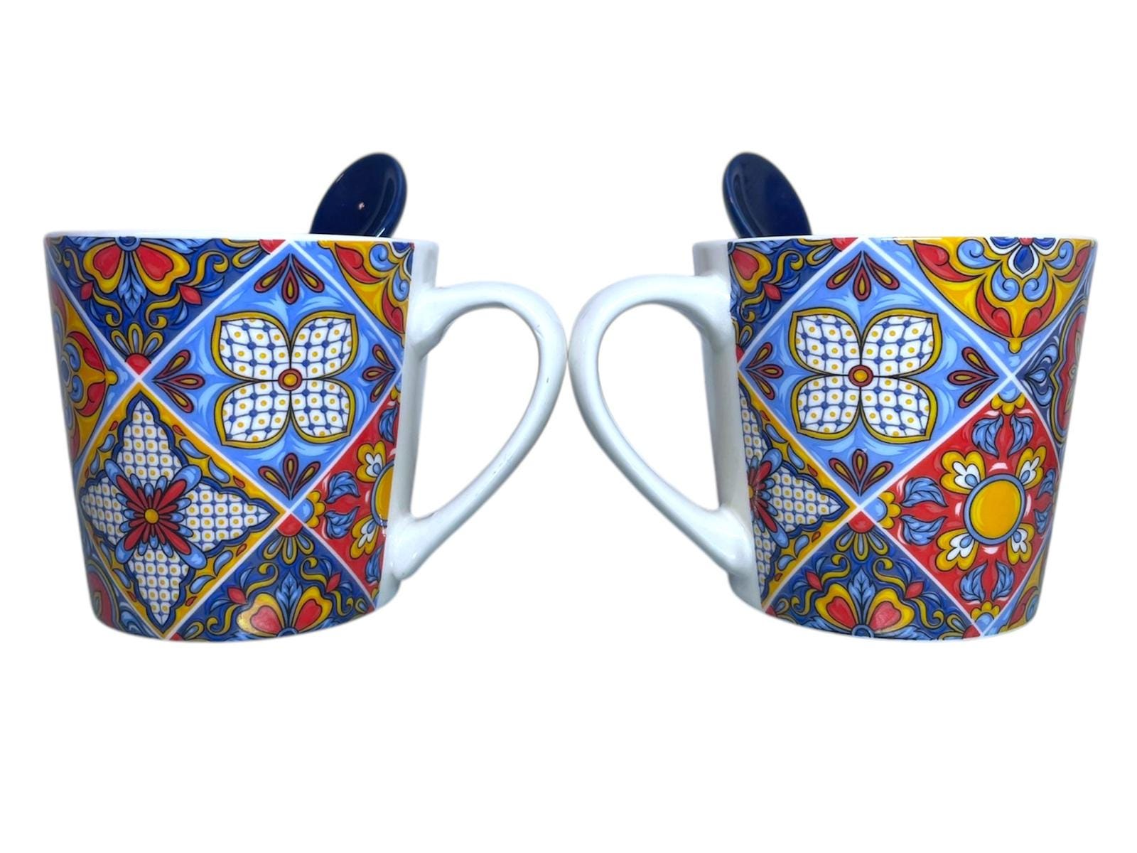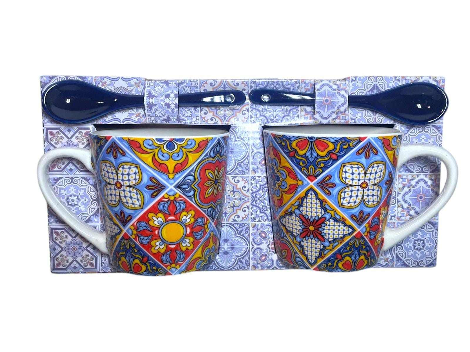 Portugal Azulejos Hand Painted Espresso Set of 2 Big Cups with Spoons in Gift Box Portugese Pottery Beautiful Gift from Portugal