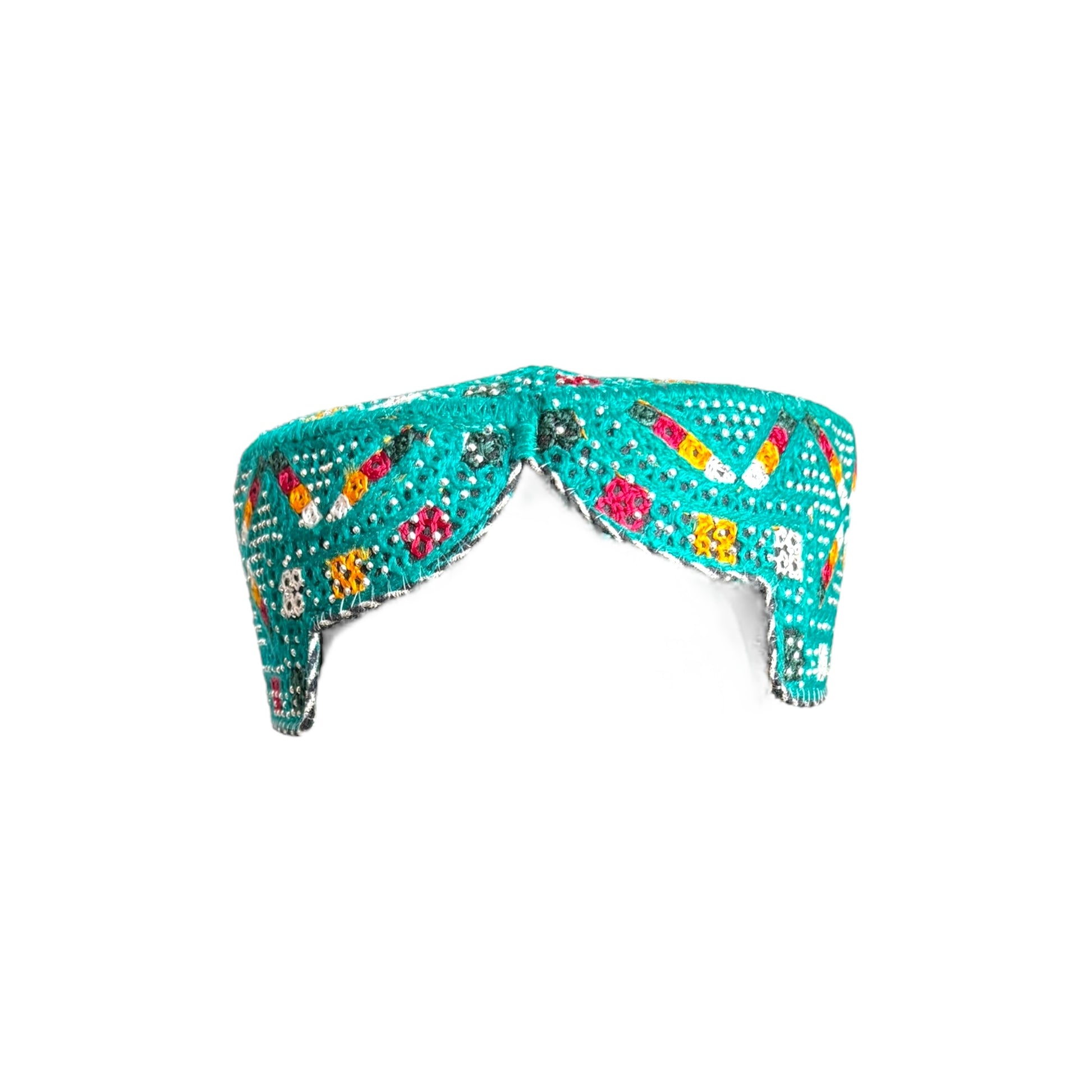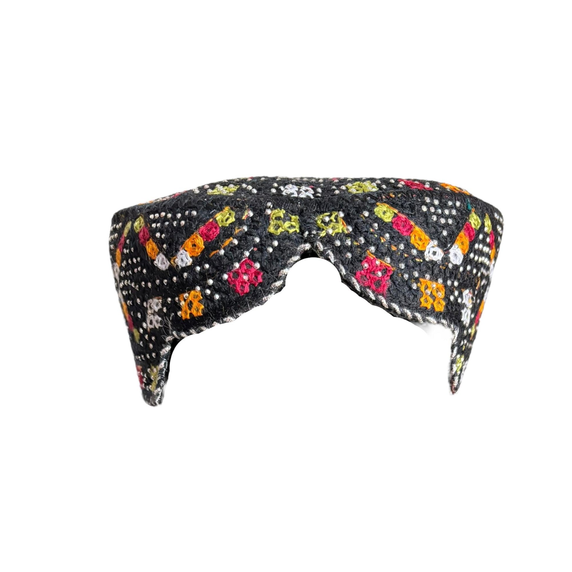 Step into the rich cultural heritage of South Asia with this exquisite Sindhi Balochi Kufi cap. This traditional headwear features stunning handcrafted embroidery and eye-catching sequence work that adds a contemporary flair to its timeless design. The distinctive front cut style and square shape make it a standout piece for both religious and cultural occasions. Perfectly sized to fit head circumferences between 55 to 57 cm, this versatile topi combines comfort with artistic craftsmanship. The vibrant details and intricate needlework showcase the region's renowned artisanal skills, making each cap a unique piece of wearable art. Whether you're attending a spiritual gathering or seeking to add an authentic traditional accent to your attire, this Sufi artist topi seamlessly blends cultural authenticity with modern appeal.